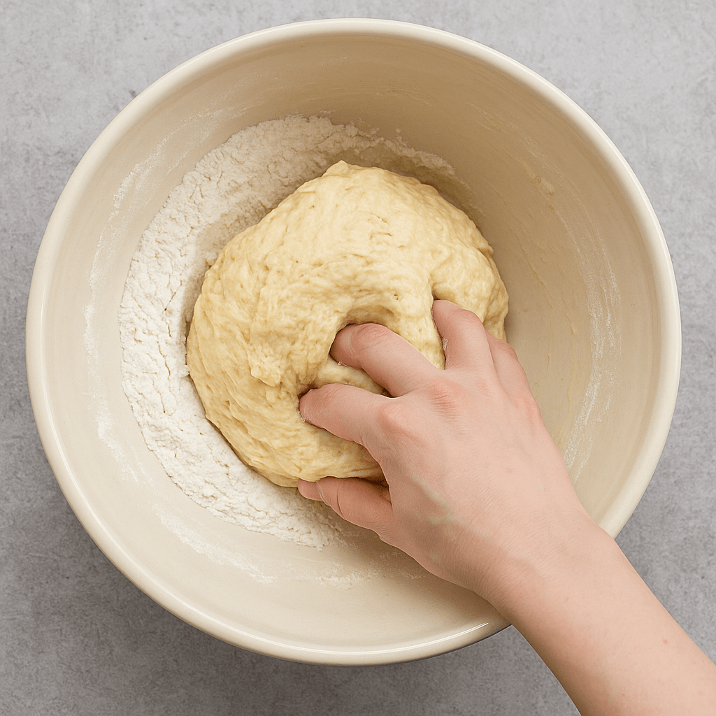 Sekoita ensin lusikalla ja vaivaa sitten käsin (tai yleiskoneella) noin 10 minuuttia, kunnes taikinasta tulee sileä ja kimmoisa.