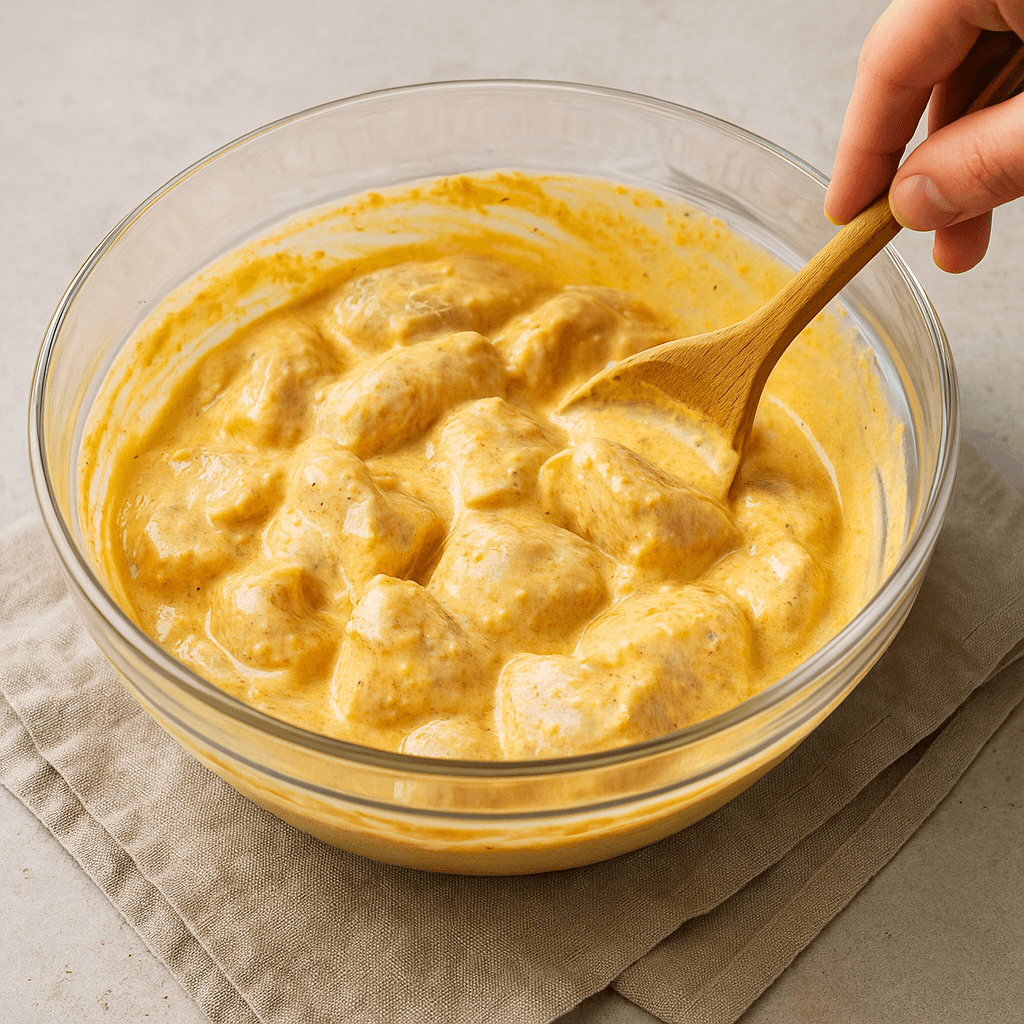 Yhdistä jogurtti, sitruunamehu, valkosipuli, inkivääri ja mausteet kulhossa. Lisää kanapalat ja sekoita hyvin. Peitä ja anna marinoitua jääkaapissa vähintään 30 minuuttia (tai yön yli, jos mahdollista).