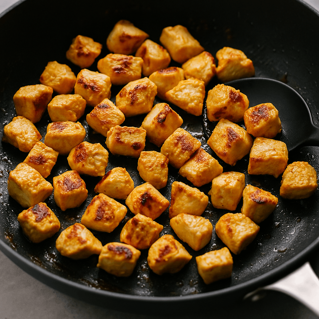Lisää paistetut kanapalat kastikkeeseen ja hauduta 10–15 minuuttia, kunnes kana on mureaa ja kypsää.