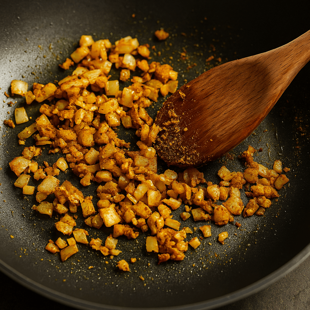Lisää pannulle tarvittaessa vähän öljyä ja kuullota sipuli. Lisää valkosipuli, inkivääri ja mausteet (garam masala, juustokumina, korianteri, kurkuma). Sekoita hetki, kunnes tuoksu on aromikas.