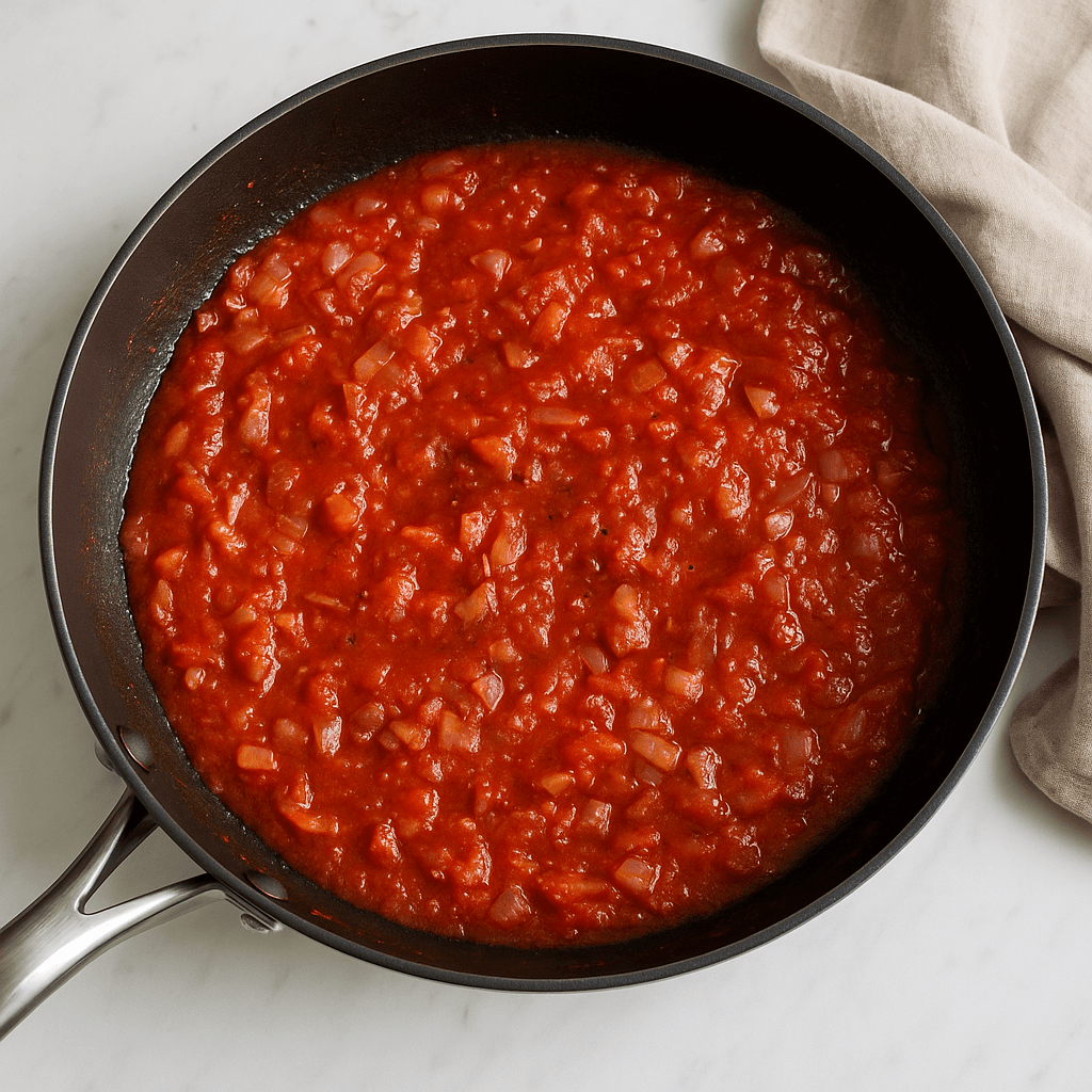 Kaada tomaattimurska pannulle, mausta sokerilla, suolalla ja pippurilla. Anna kiehua miedolla lämmöllä noin 10 minuuttia.