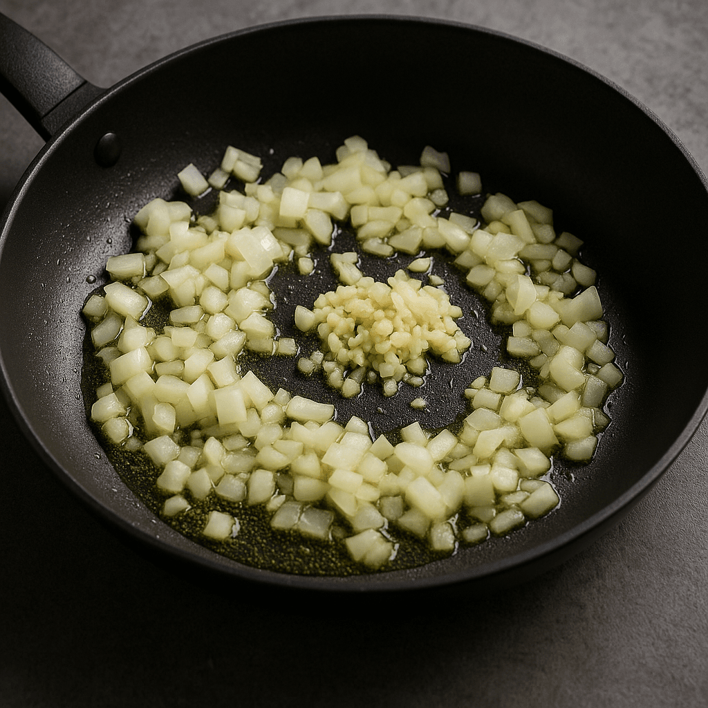 Kuumenna öljy tai voi pannulla. Lisää hienonnettu sipuli ja valkosipuli, ja paista, kunnes ne ovat pehmeitä ja läpikuultavia.