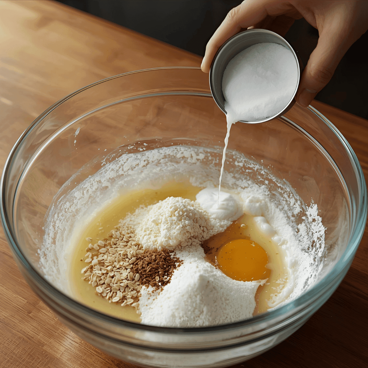 Lisää kaurahiutaleet, vehnäjauhot, leivinjauhe, vaniljasokeri ja suola. Sekoita tasaiseksi taikinaksi.
