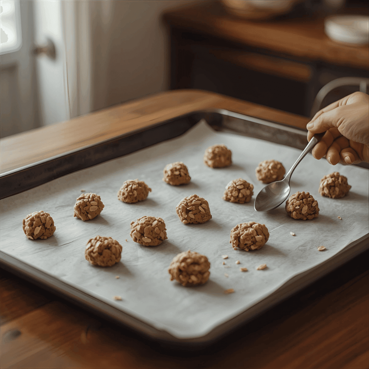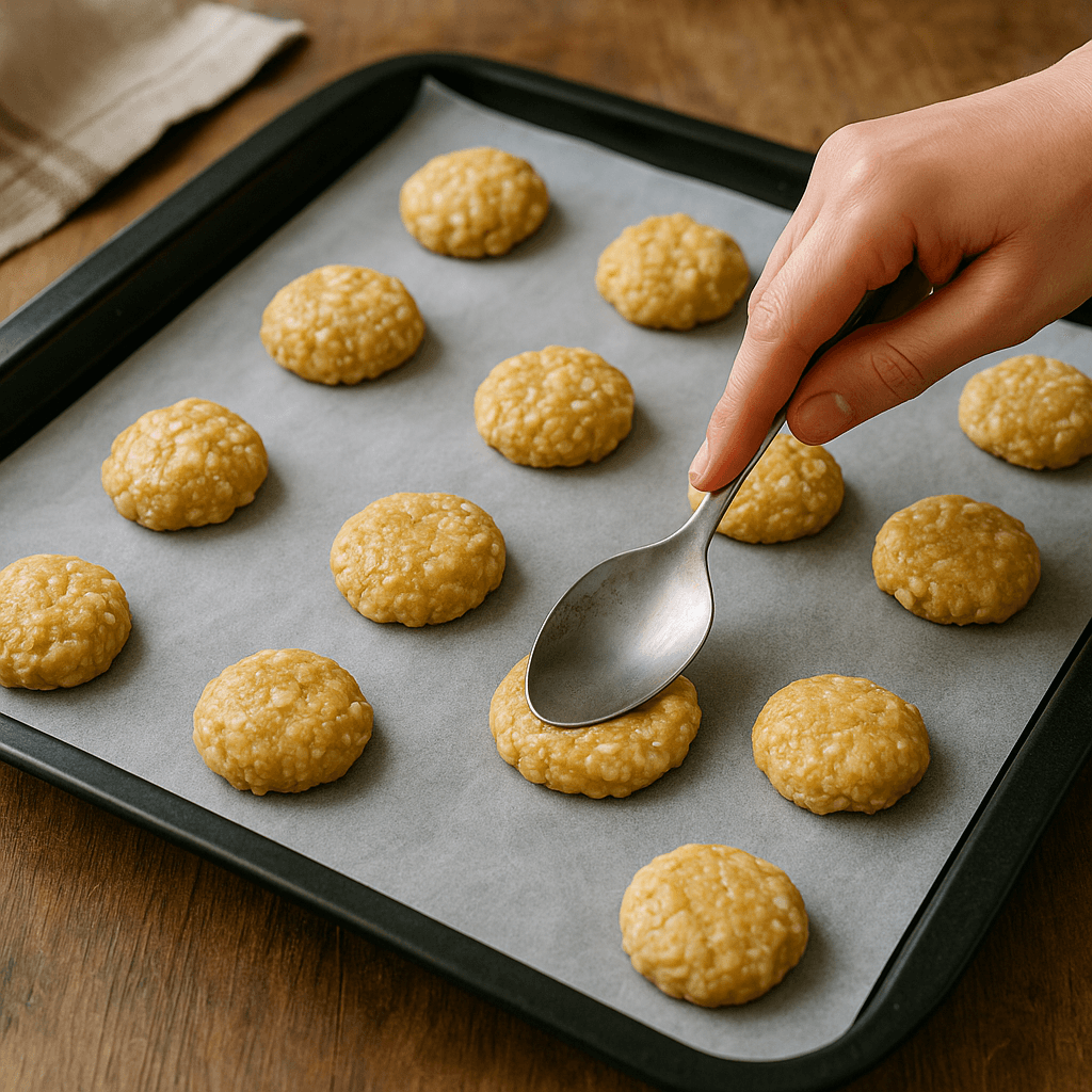 Muotoile taikinasta pieniä palloja lusikan avulla ja aseta ne leivinpaperilla vuoratulle pellille.