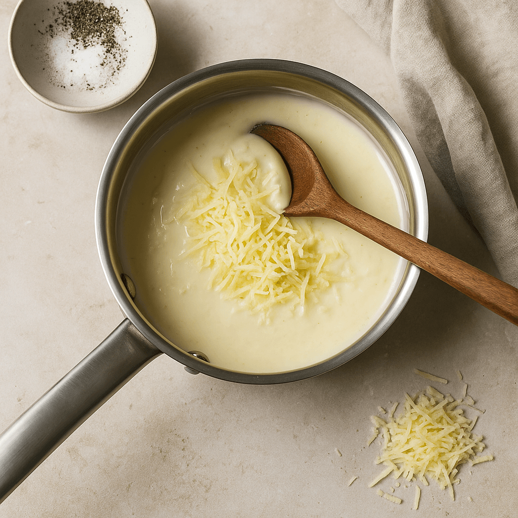 Ota kattila pois liedeltä ja lisää juustoraaste (sekä kananmuna, jos käytät).