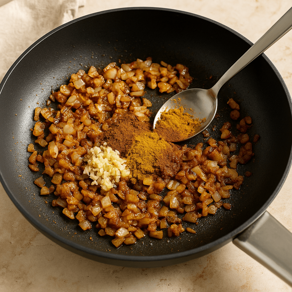Mausteet, kuten kumina, garam masala, inkivääri ja valkosipuli, antavat ruoalle sen syvyyden ja lämpimän, mausteisen tuoksun.