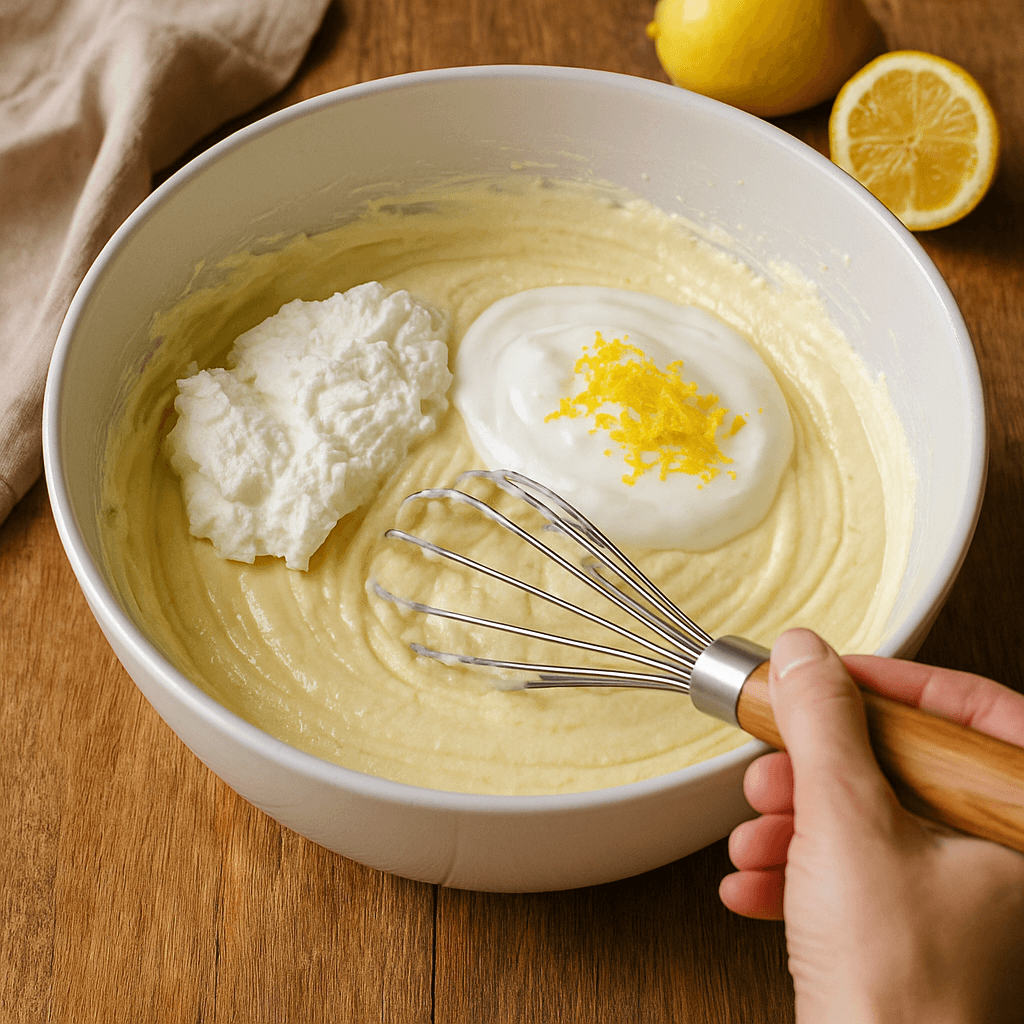 Lisää rahka, kerma, sitruunamehu ja kuori. Sekoita tasaiseksi.