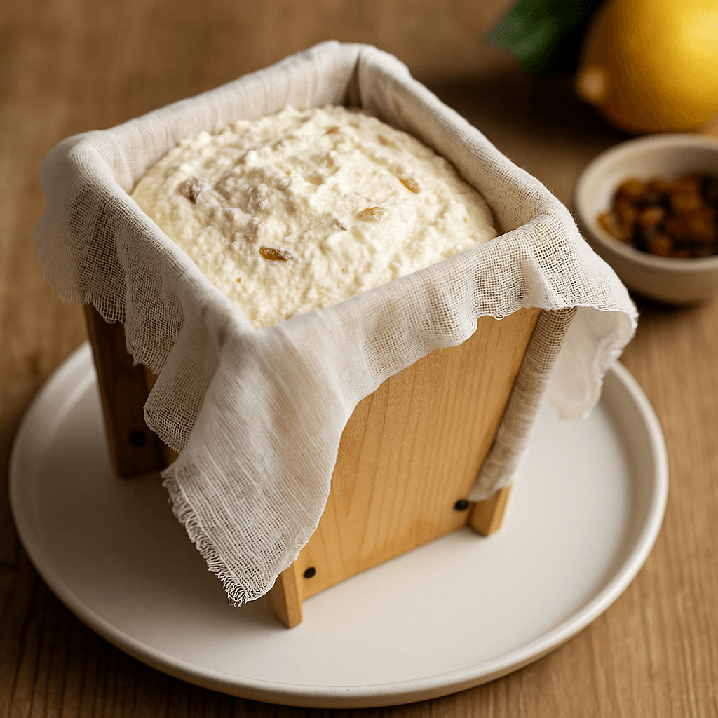 Perinteinen suomalainen Pasha Resepti – kermainen, raikas ja sitruunainen pääsiäisjälkiruoka, joka tuo kevään ja juhlan makua pöytään.