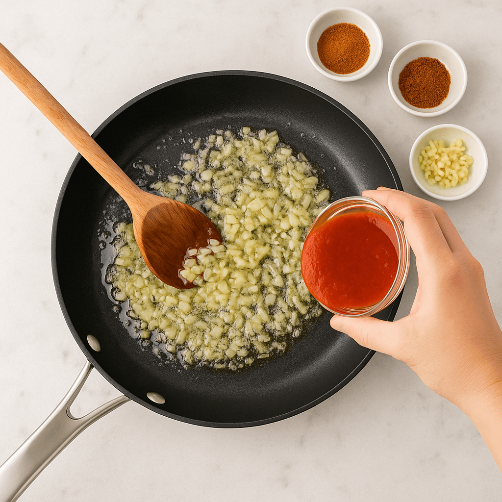 Kuumenna voi pannulla, lisää sipuli ja kuullota. Lisää valkosipuli, tomaattipyree ja mausteet.